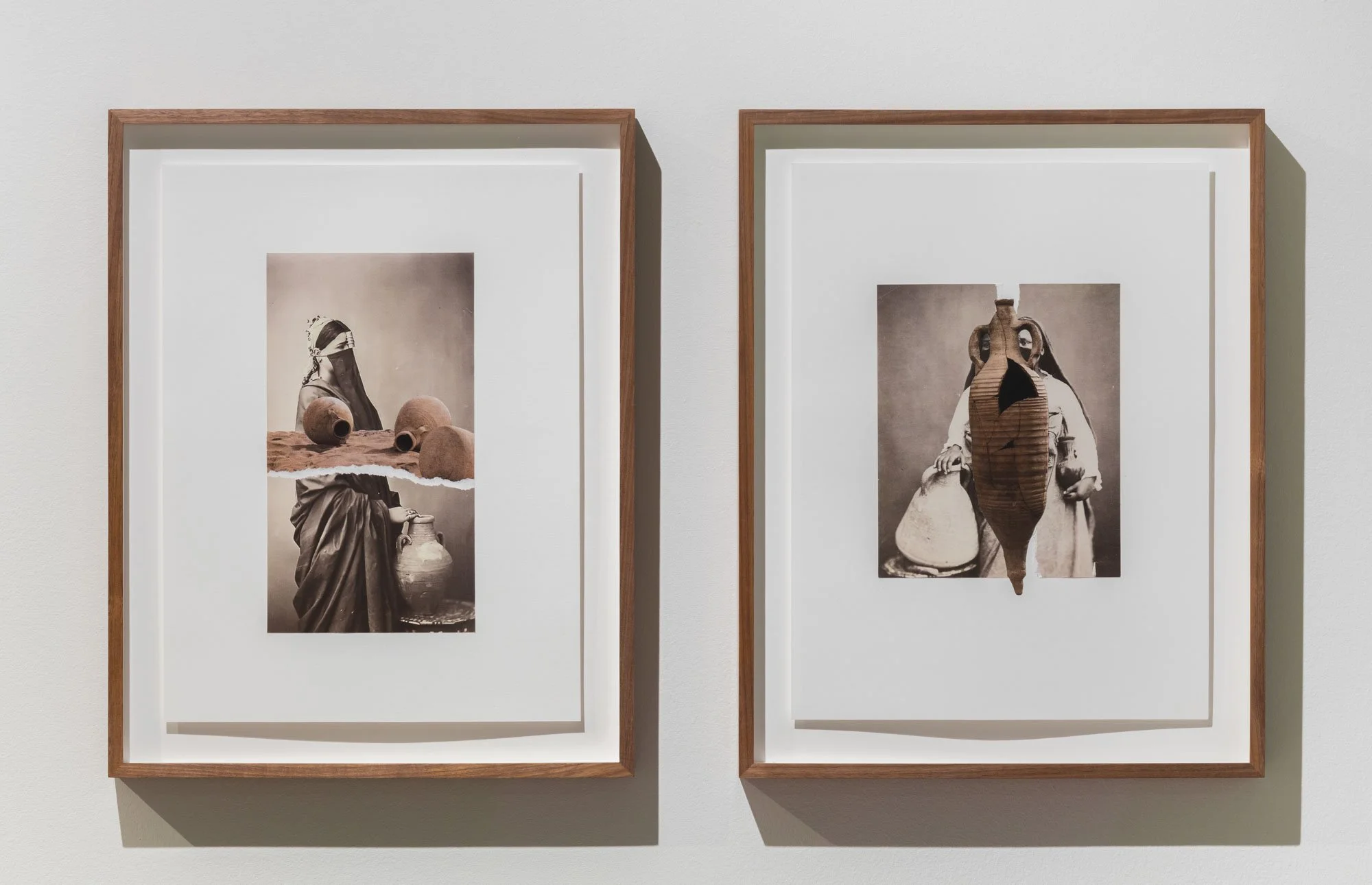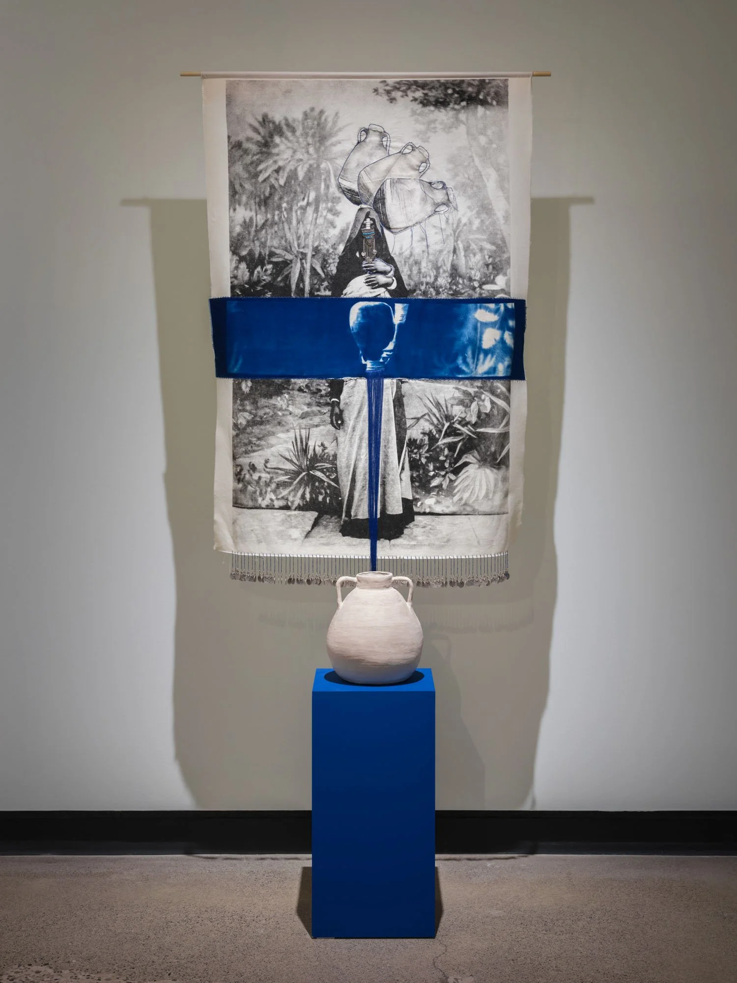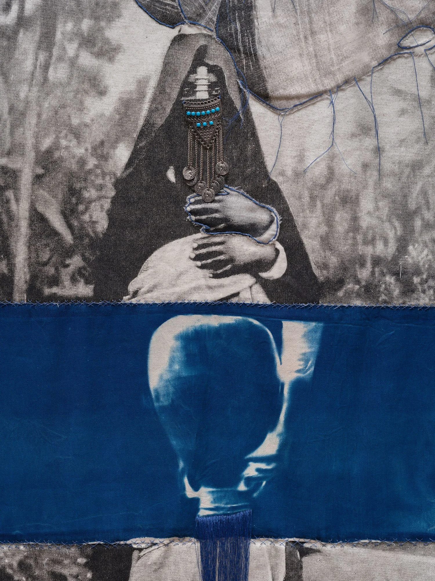 Through techniques such as repetition, redaction, tearing, and erasure, the collages challenge the perceived preciousness of archival images. Ceramic collages merge Orientalist imagery with clay, grounding photographic representation in material reality. Textile works layer screen-printed photographs with cyanotypes and embellishments, while lenticular prints expose the repeated use of poses and props. Cyanotypes serve as both a reference to water and an allusion to photography’s foundational role in shaping early portrayals of SWANA women.