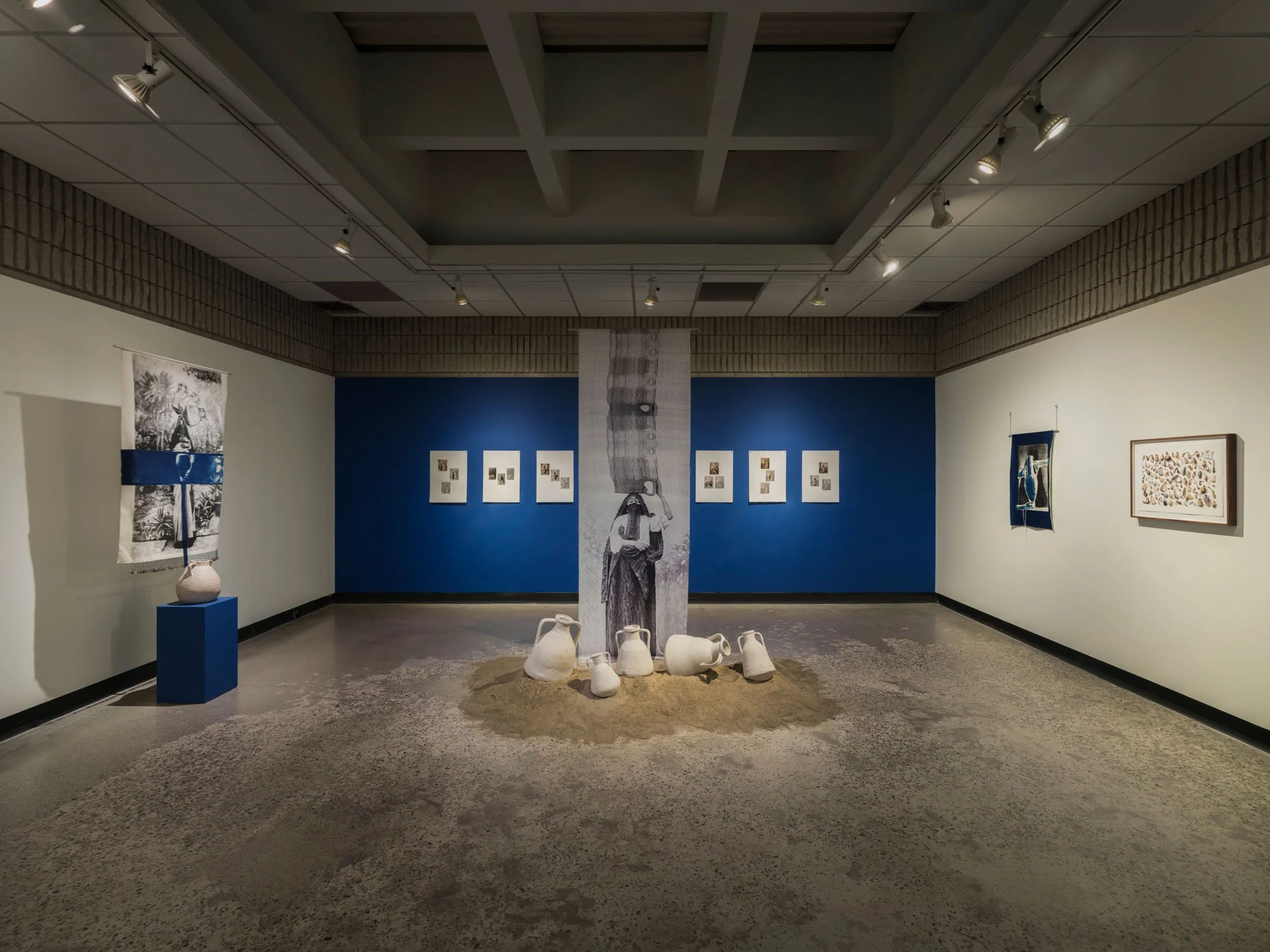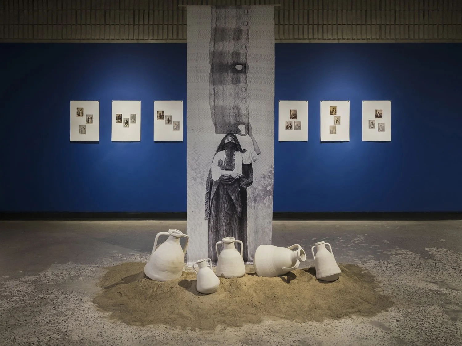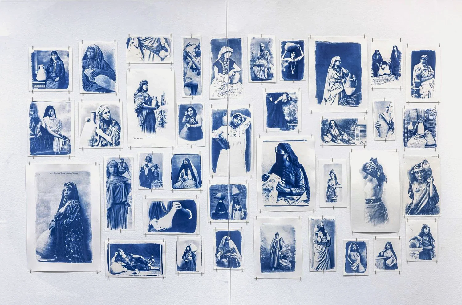 Through techniques such as repetition, redaction, tearing, and erasure, the collages challenge the perceived preciousness of archival images. Ceramic collages merge Orientalist imagery with clay, grounding photographic representation in material reality. Textile works layer screen-printed photographs with cyanotypes and embellishments, while lenticular prints expose the repeated use of poses and props. Cyanotypes serve as both a reference to water and an allusion to photography’s foundational role in shaping early portrayals of SWANA women.