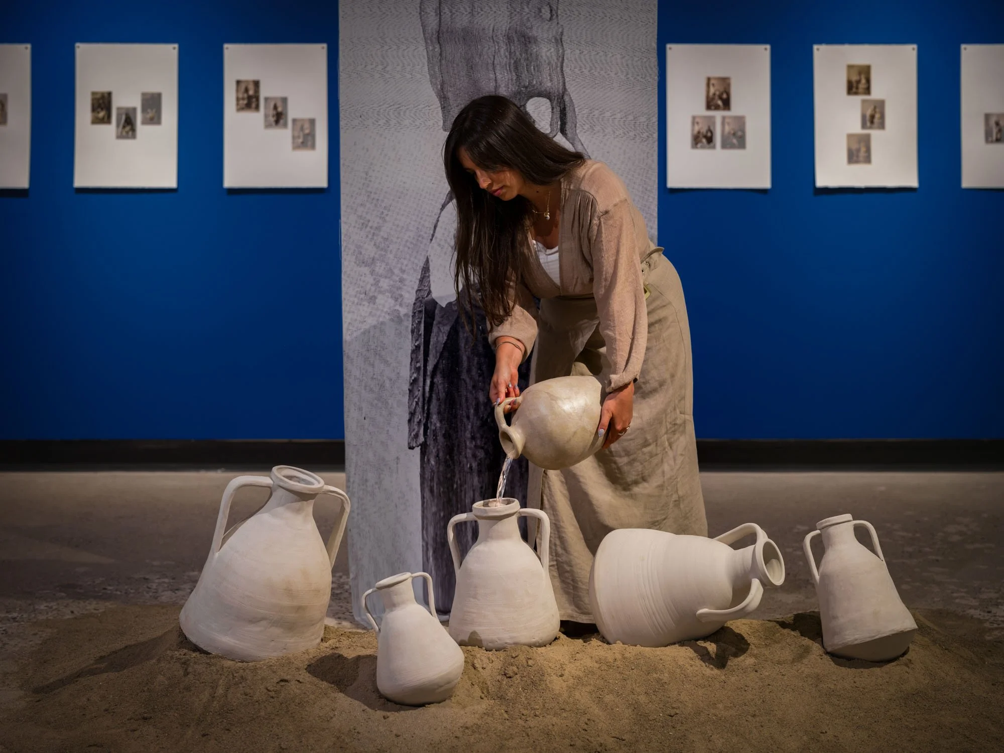 Within the expansive history of photography, depictions of women, particularly from the SWANA (South West Asia and North Africa) region, have often been imbued with symbolism that undermines their agency, subjecting them to a struggle between their identities and the ideologies imposed upon them. A Vessel to Bend Water emerges as a critical response to this historical context, drawing from Orientalist digital archives and physical postcards to explore the intricate link between photographic representation and the props used to denote societal status. Central to this exploration is the vessel, a recurring visual metaphor in Orientalist photography, employed to perpetuate colonial agendas and shape societal perceptions of women, their bodies, and their prescribed roles.