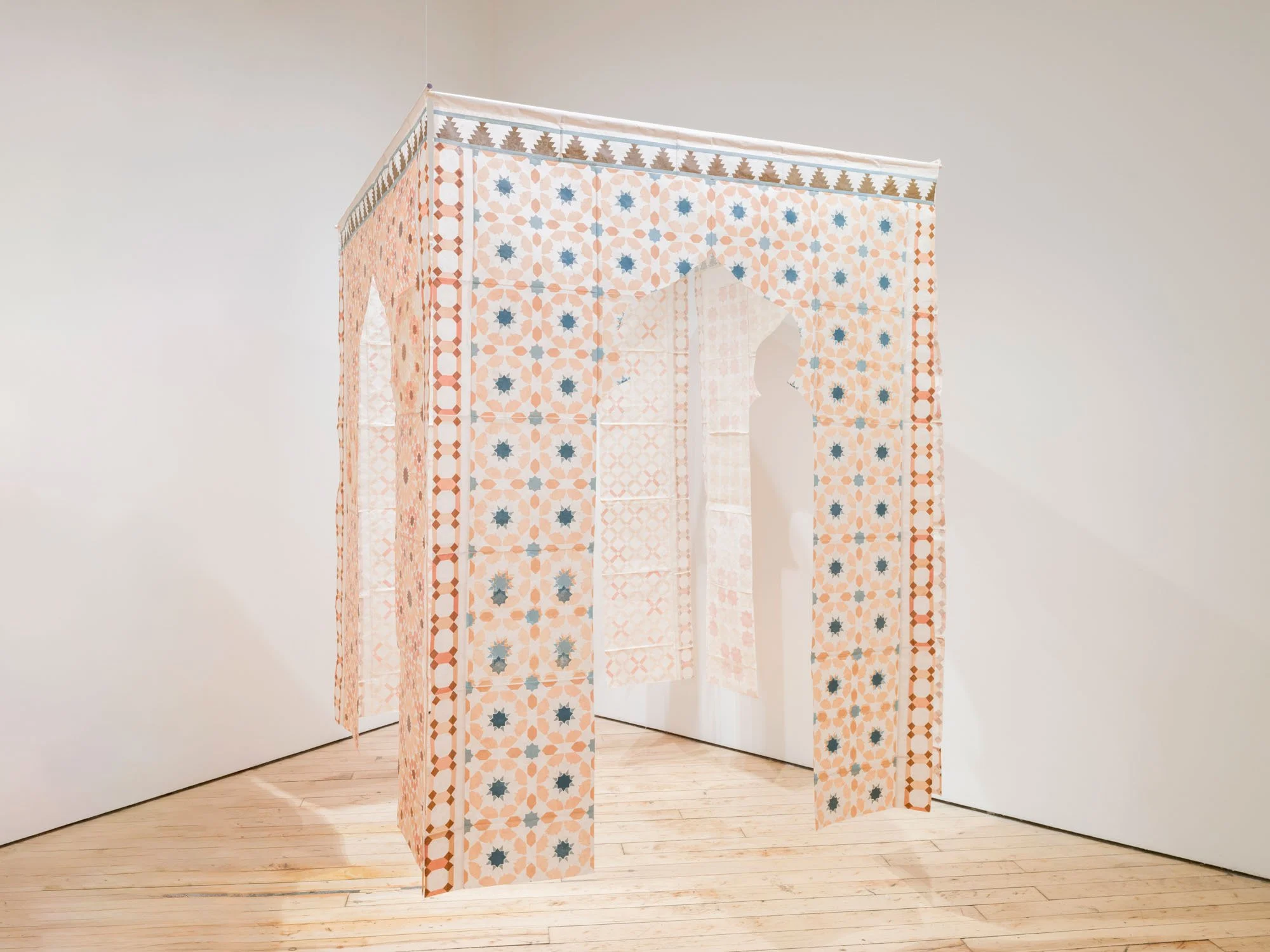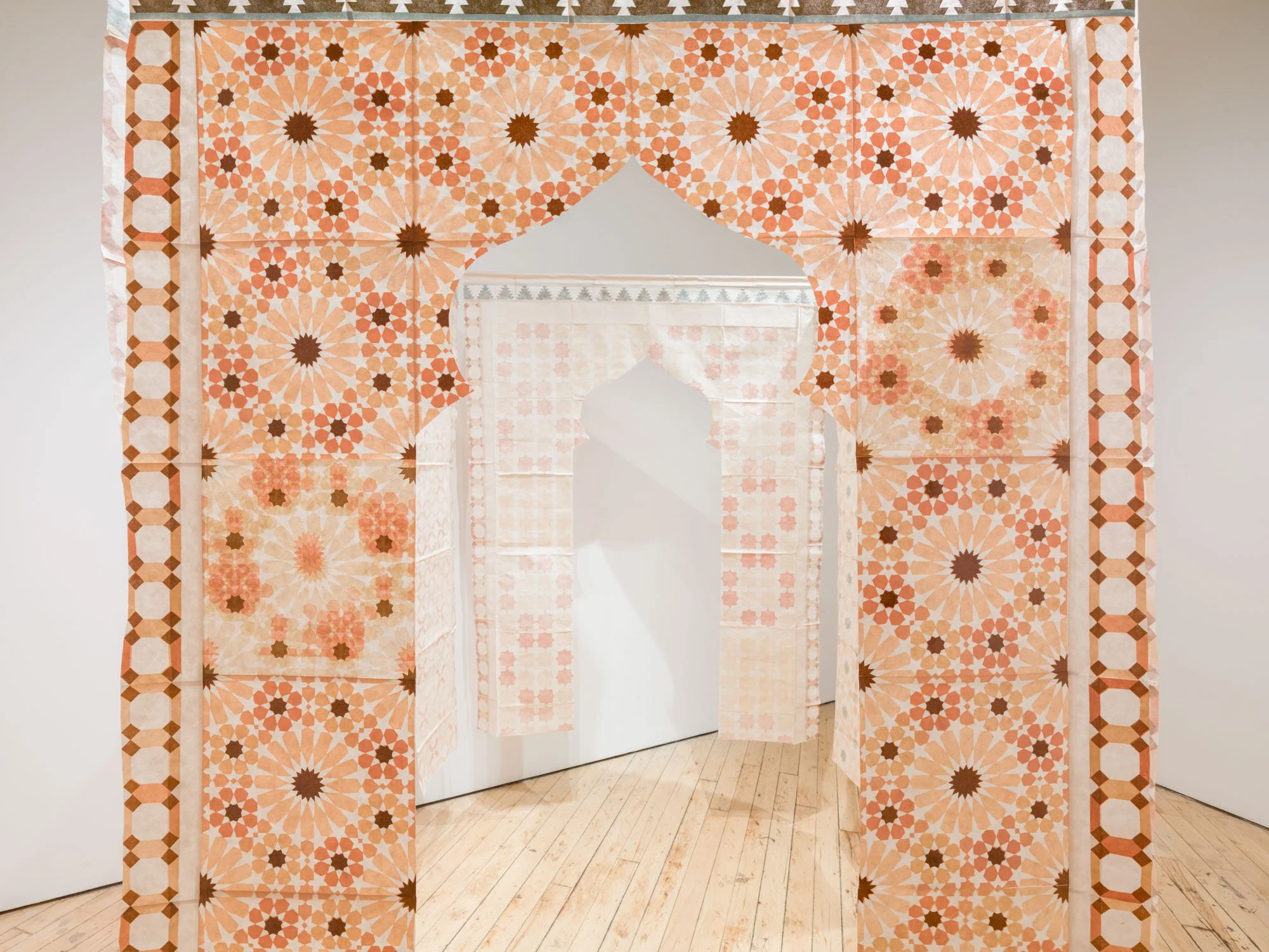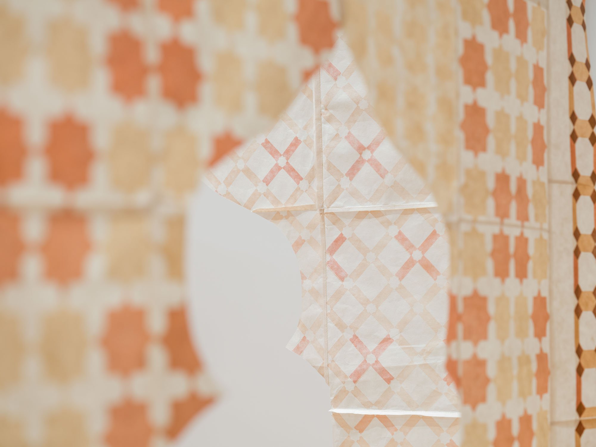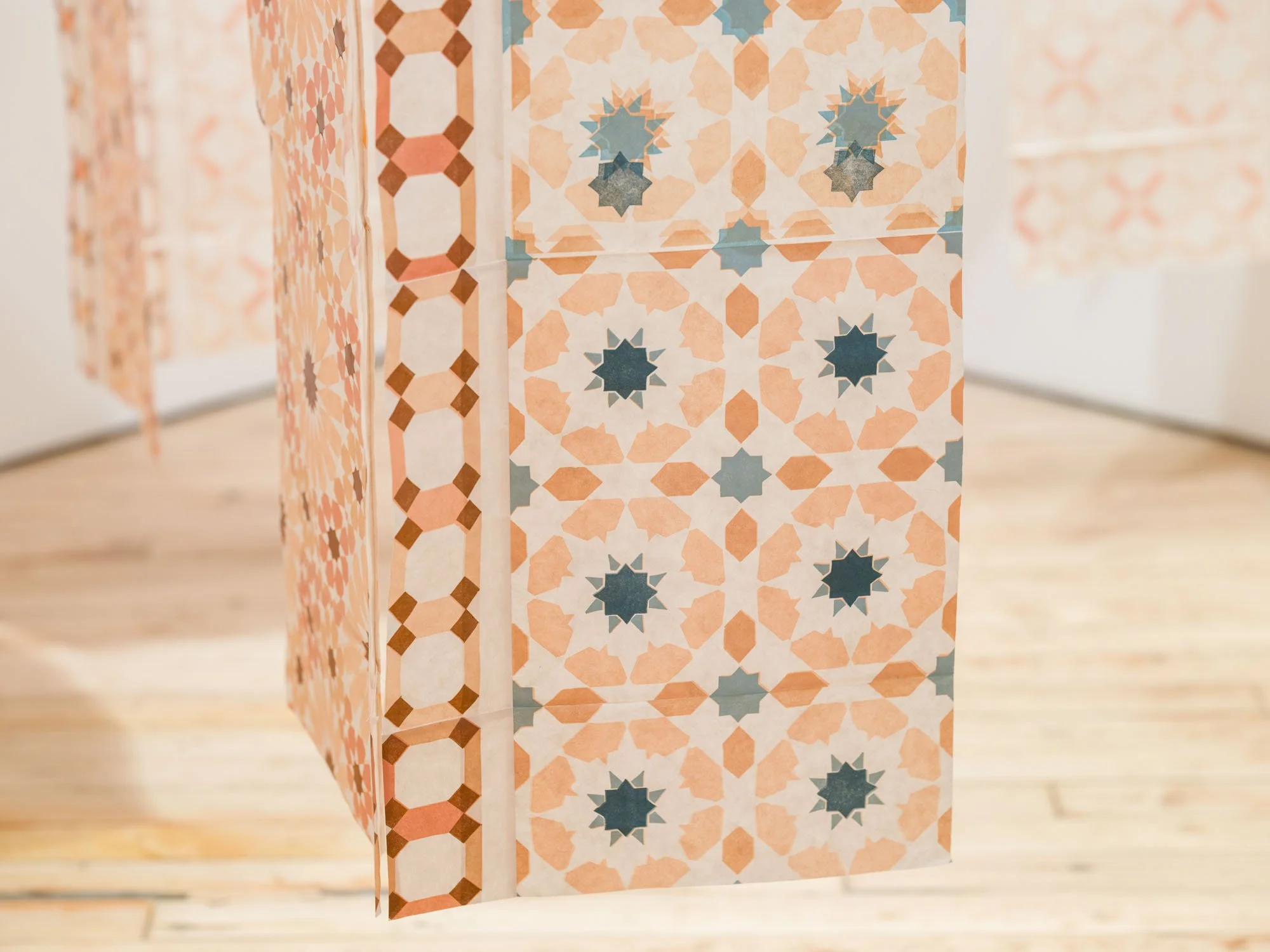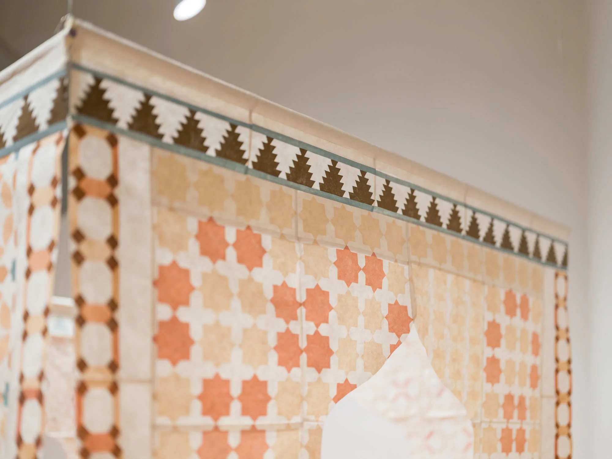 the stars wish to rest here is a contemplative installation reflecting an exploration of Islamic geometry as a framework for engaging with spirituality, interconnectedness, and cultural memory. Inspired by a first visit to the Alhambra, an iconic monument of Islamic architecture, the installation reimagines its intricate geometric patterns through hand-carved linocut prints.
